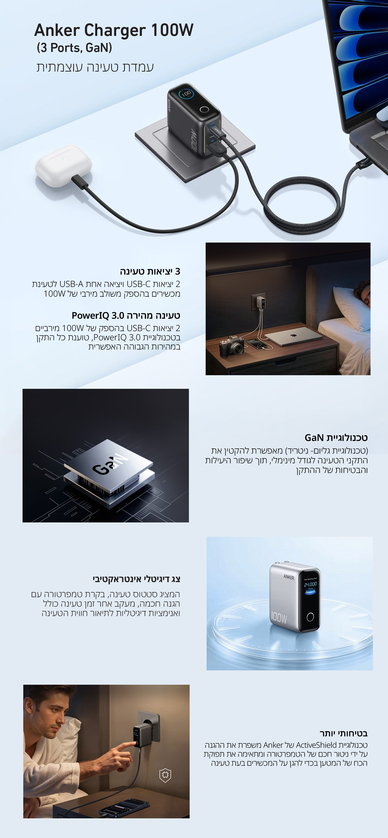 תאימות אוניברסלית לטעינה מהירה בטכנולוגיית PowerIQ 3.0 של Anker: שתי יציאות USB-C בהספק של 100W מירביים בטכנולוגיית 3.0 PowerIQ, טוענת כל התקן במהירות הגבוהה האפשרית; תמיכה ב-PD3.0 ו-UFCS.
