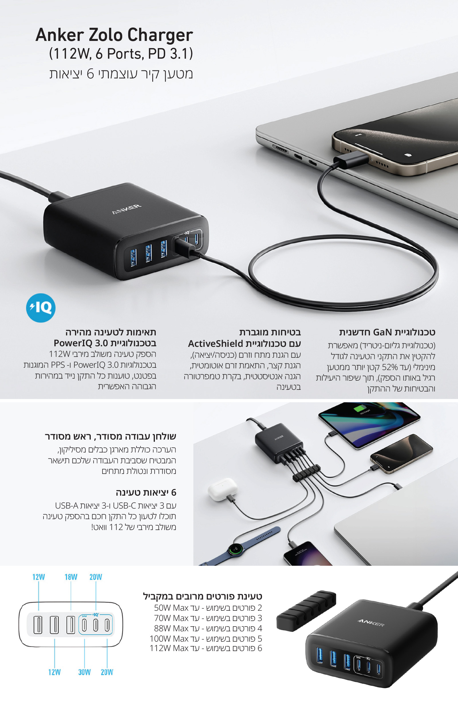 למפרט המלא לחצו כאן6 יציאות טעינה: עם 3 יציאות USB-C ו-3 יציאות USB-A תוכלו לטעון כל התקן חכם בהספק טעינה משולב מירבי של 112 וואט במטען שתוכנן לצרכים המודרניים ולכל התקן דיגיטלי.
