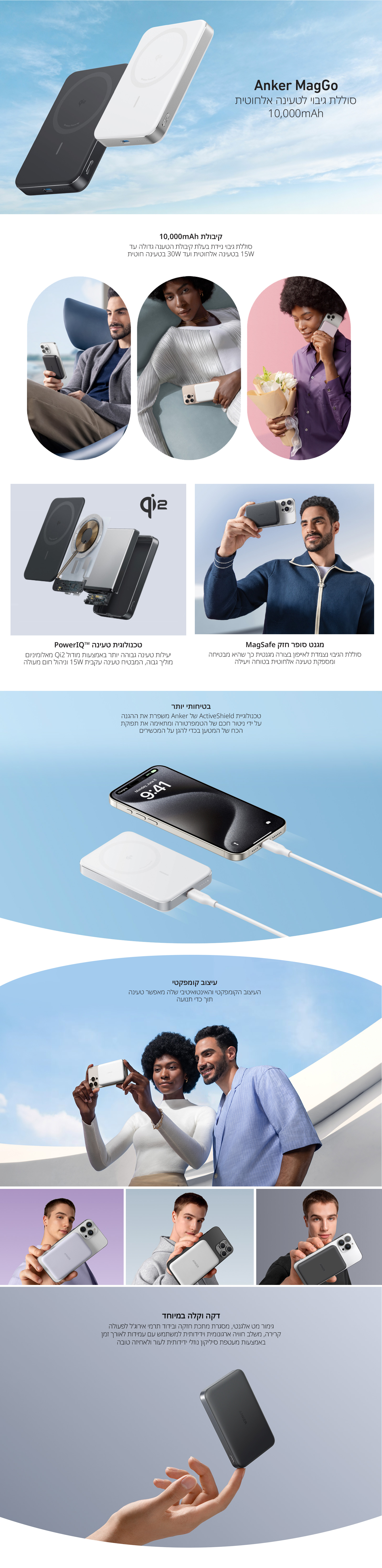 למפרט המלא לחצו כאןסוללה בקיבולת 10,000mAh - סוללת גיבוי ניידת דקה במיוחד מספקת ניידות יוצאת דופן מבלי להתפשר על קיבולת האנרגיה; מצוידת במשטח טעינה אלחוטי Qi2 בהספק 15W (מקסימום) מותאמת לתקן MagSAfe ויציאת USB-C בהספק 30W (מקסימום).