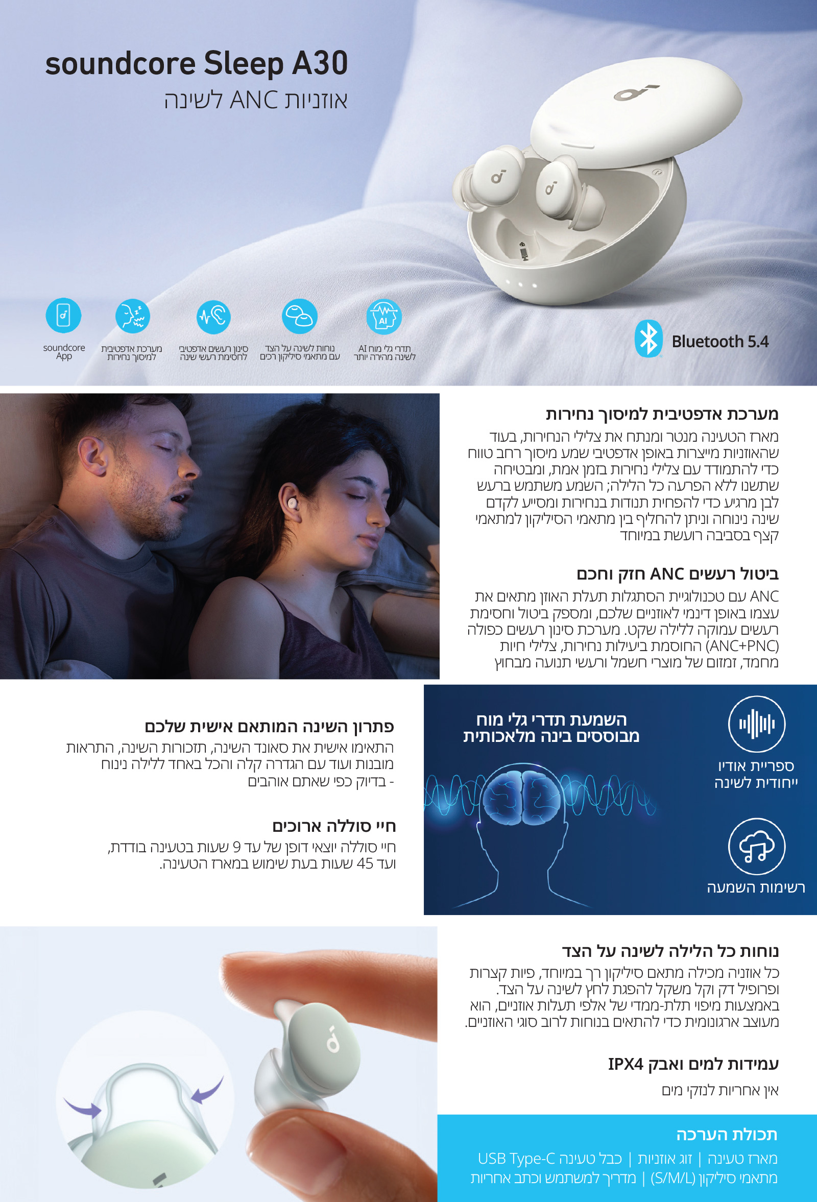מארז טעינה / זוג אוזניות A30 / כבל טעינה USB-C / מתאמי סיליקון Ear Tips (XS/S/M/L) / מתאמי קצף Ear Tips (S/M/L) / מדריך למשתמש וכתב אחריות