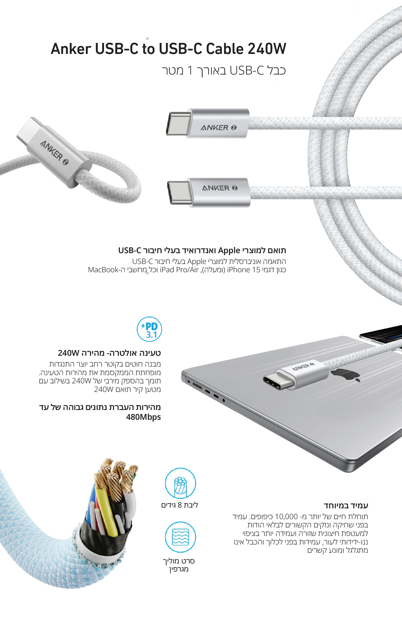 למפרט המלא לחצו כאןכבל USB-C to USB-C באורך 1 מטר.