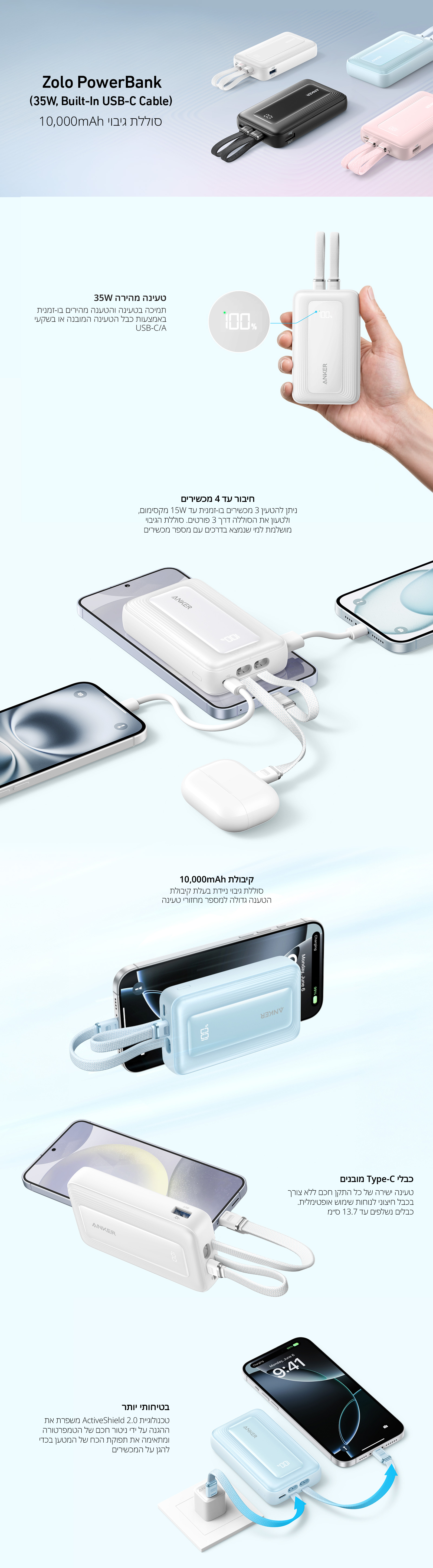 כבלי USB-C מובנים - כבלי Type-C קלועים בעלי עמידות גבוהה בפני קיפולים וכיפופים (מעל 10,000 כיפופים), ובאורך 13.7 ס"מ.